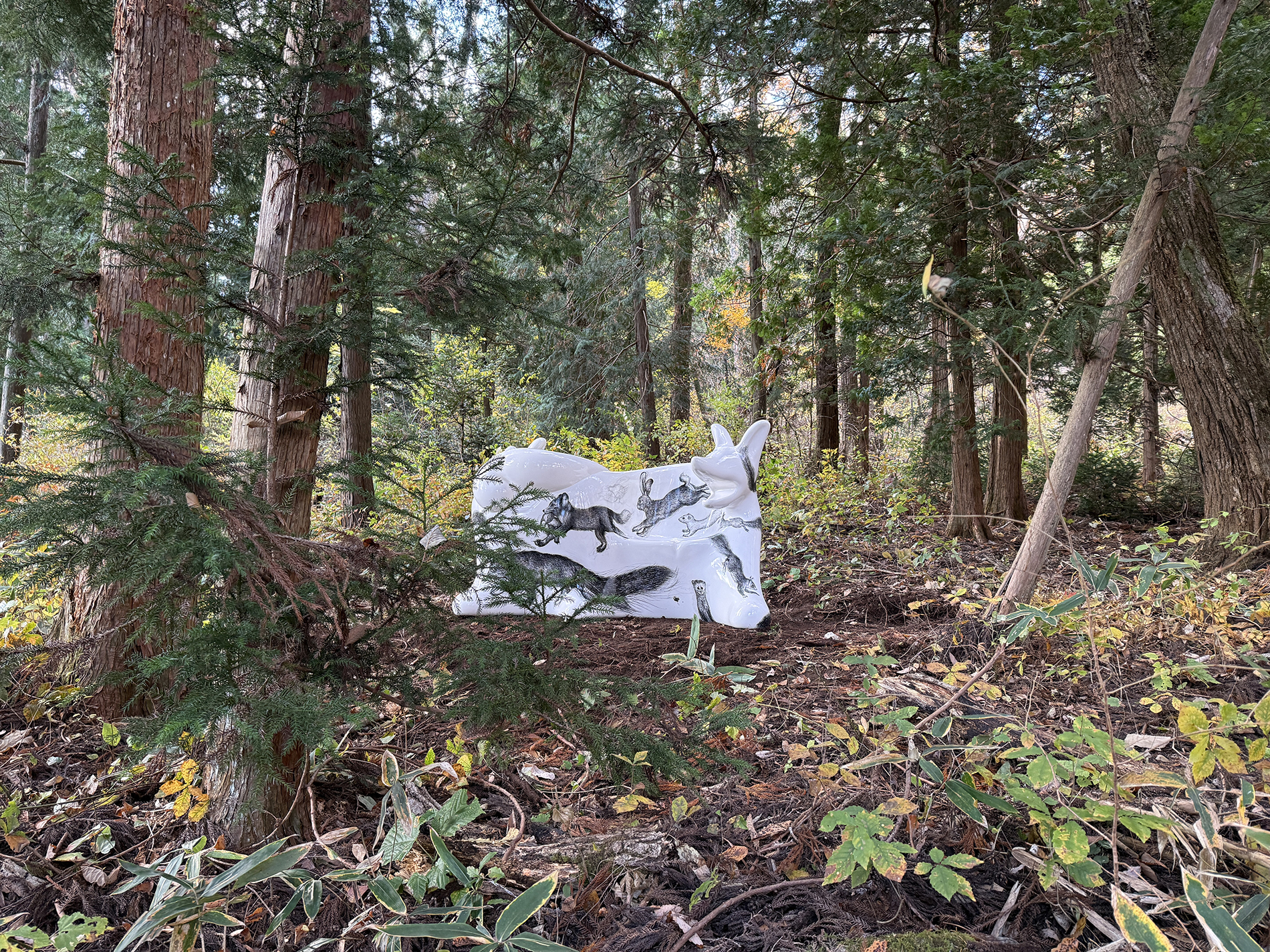The Wolf Bench / Animal Drawings was installed on November 10, 2025, at Yamatsumi Shrine in Iitate Village, Soma District, Fukushima—where traditions honoring wolves and white wolves still remain.