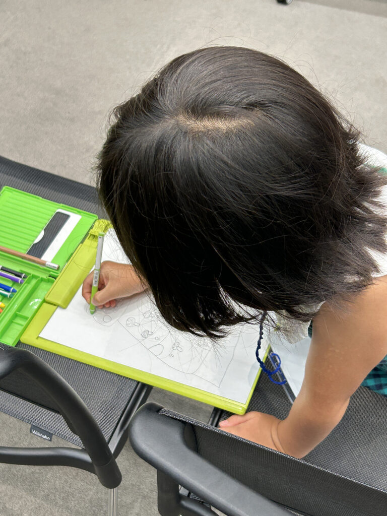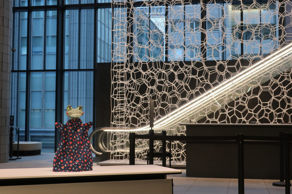 朝、集合場所のレクチャールームにカエルちゃんがいると、参加者は自然と前の方に座ってくれます。早く来た家族が自由に遊びはじめる姿も見ることができました。2年生の女の子は、カエルちゃんを膝にのせて、まず自分に向かって上手に手を動かして、じっと眺めた後で、隣りのお母さんにカエルちゃんを見せていました。