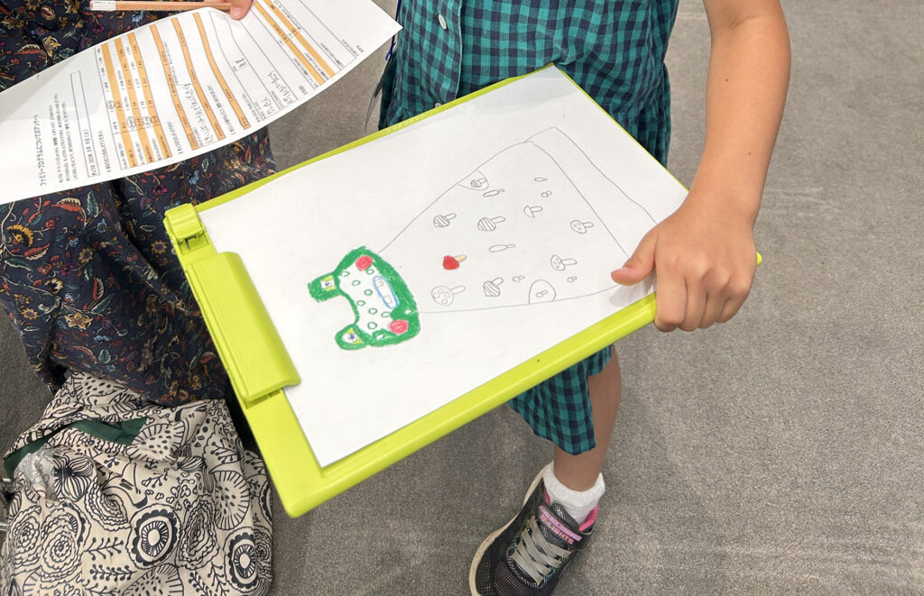 「かわいいね/いろんなところが光っていて素敵/(親子でスケッチをしながら)キノコもちゃんと描いているね/手も描いたのね/木の台にのっているよ(→台座を描き足す)」「(他の子も)ねぇ、カエルちゃん触らせて/すごくしっかりつくってある/粘土を乾かしたのかな」といった会話や一緒に記念写真を撮ったりして、楽しそうでした。