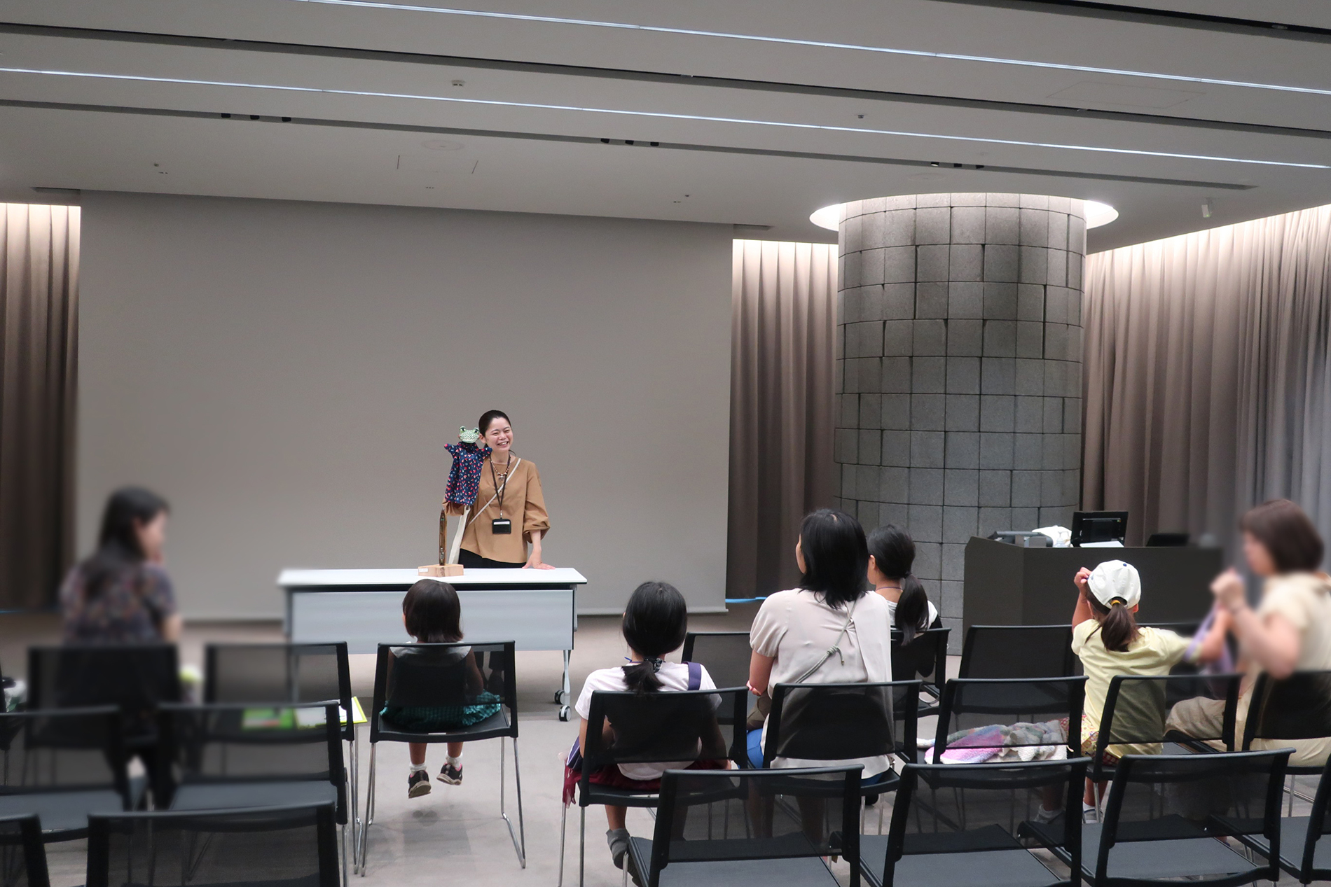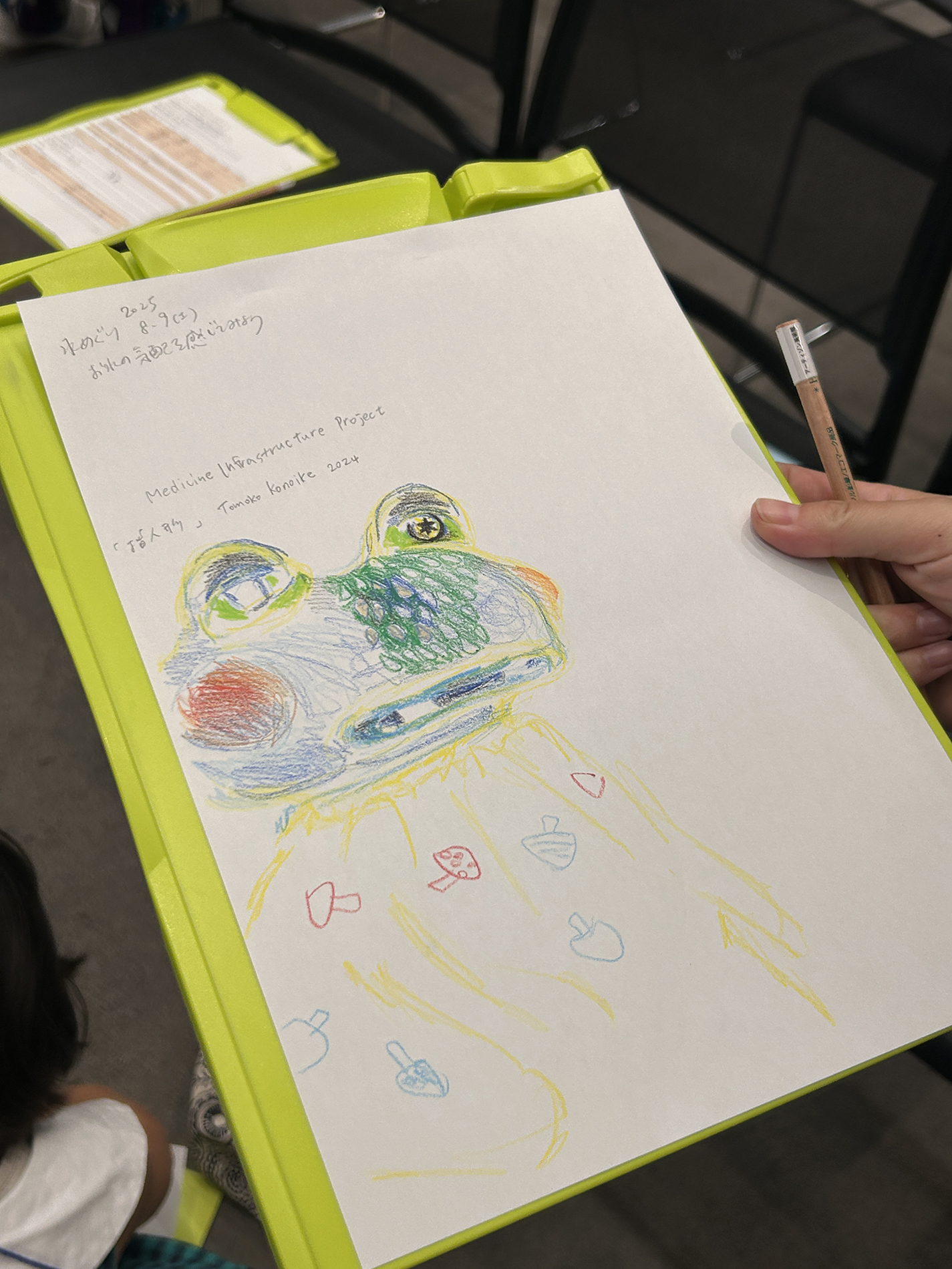 朝、集合場所のレクチャールームにカエルちゃんがいると、参加者は自然と前の方に座ってくれます。早く来た家族が自由に遊びはじめる姿も見ることができました。2年生の女の子は、カエルちゃんを膝にのせて、まず自分に向かって上手に手を動かして、じっと眺めた後で、隣りのお母さんにカエルちゃんを見せていました。