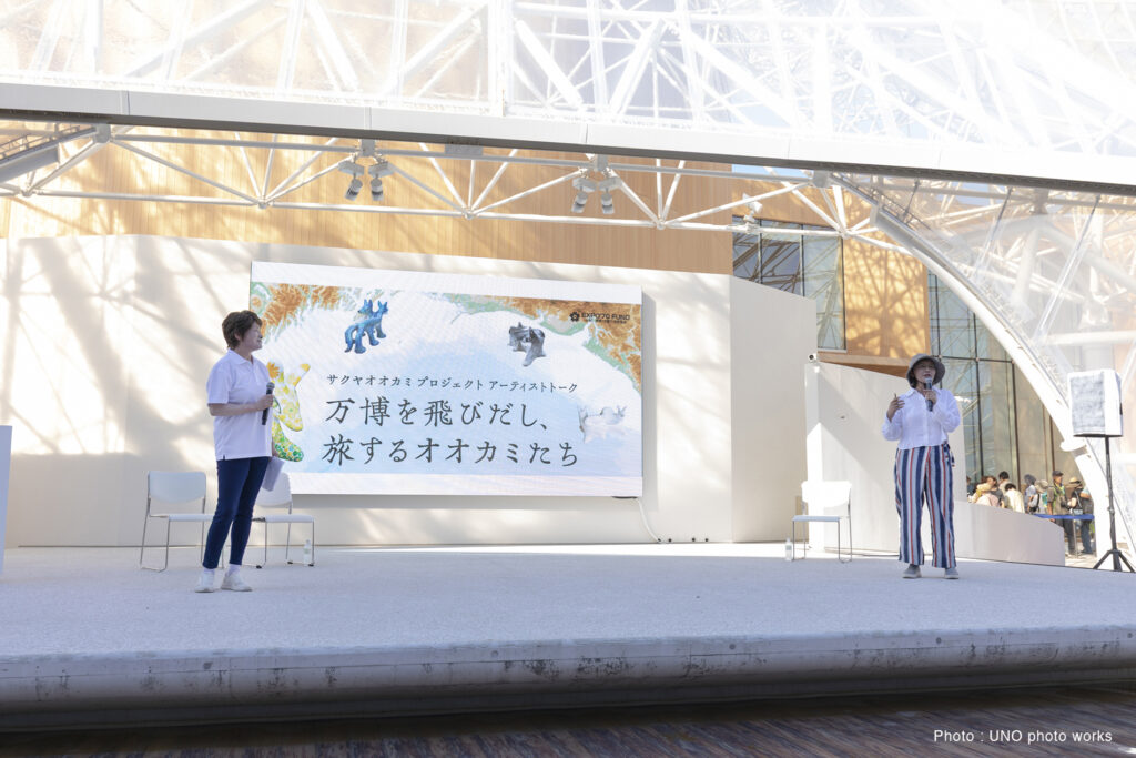 10個のオオカミベンチ(Wolf Bench)は、アーティスト鴻池朋子によって万博のために制作された座る作品で、万博終了後には作品は世界各地へ、無償で貸し出しをされていきます。「サクヤオオカミ プロジェクト」は、美術館に作品を観に行くのではなく、アートを必要とする場所へ、作品がこちらから出掛けてゆき、その場に喜びや元気を生みだしていきます。そしてまた、オオカミベンチと共に過ごした人々は、次のアートを必要としている誰かのために作品をバトンとして送りだす、という、アートが持つ本来的なエネルギー循環を目指していくプロジェクトです。オオカミがあなたを優しく包み込みます。ぜひ実際に座って、撫でてご堪能ください。