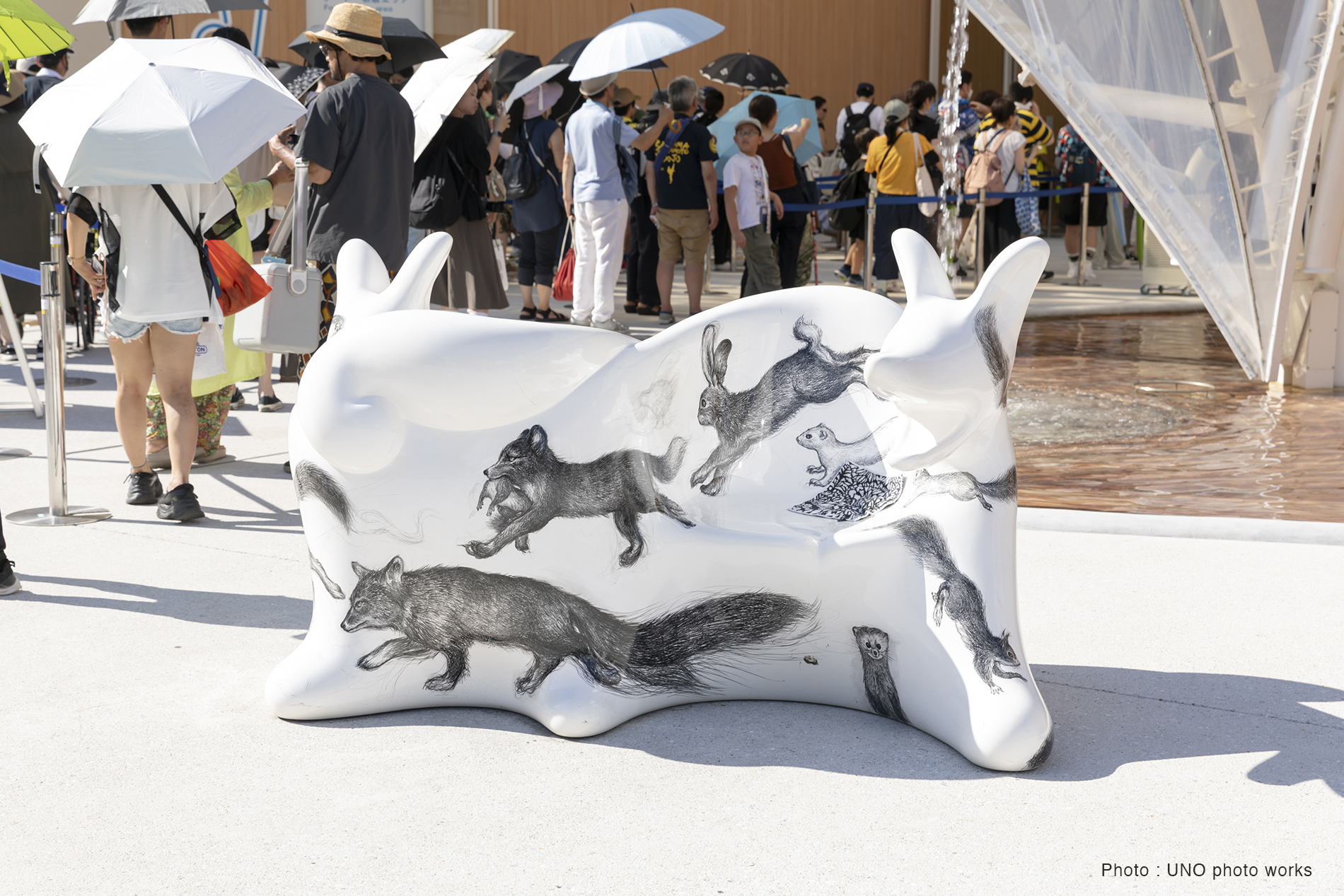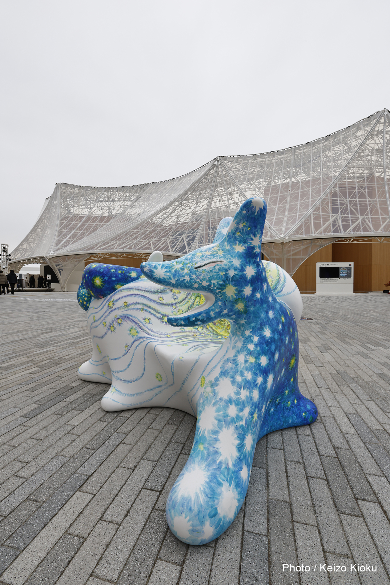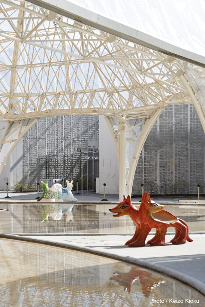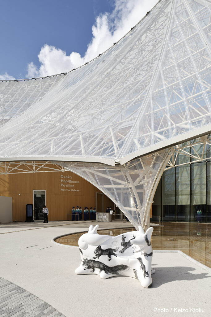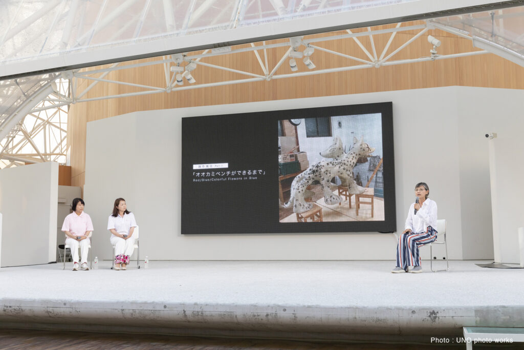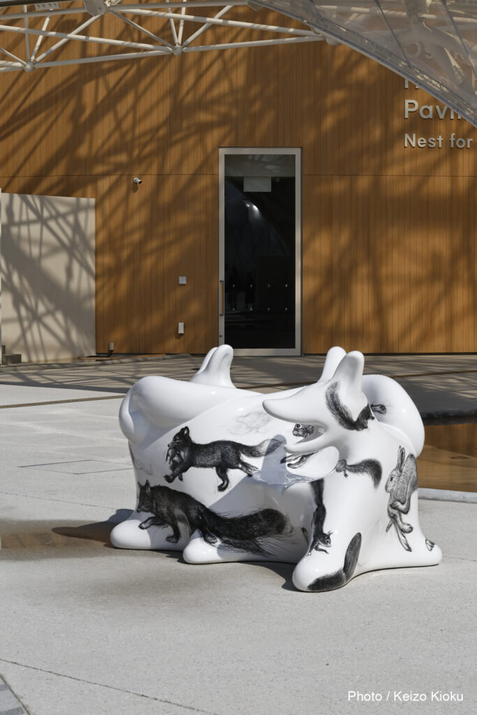 10個のオオカミベンチ(Wolf Bench)は、アーティスト鴻池朋子によって万博のために制作された座る作品で、万博終了後には作品は世界各地へ、無償で貸し出しをされていきます。「サクヤオオカミ プロジェクト」は、美術館に作品を観に行くのではなく、アートを必要とする場所へ、作品がこちらから出掛けてゆき、その場に喜びや元気を生みだしていきます。そしてまた、オオカミベンチと共に過ごした人々は、次のアートを必要としている誰かのために作品をバトンとして送りだす、という、アートが持つ本来的なエネルギー循環を目指していくプロジェクトです。オオカミがあなたを優しく包み込みます。ぜひ実際に座って、撫でてご堪能ください。