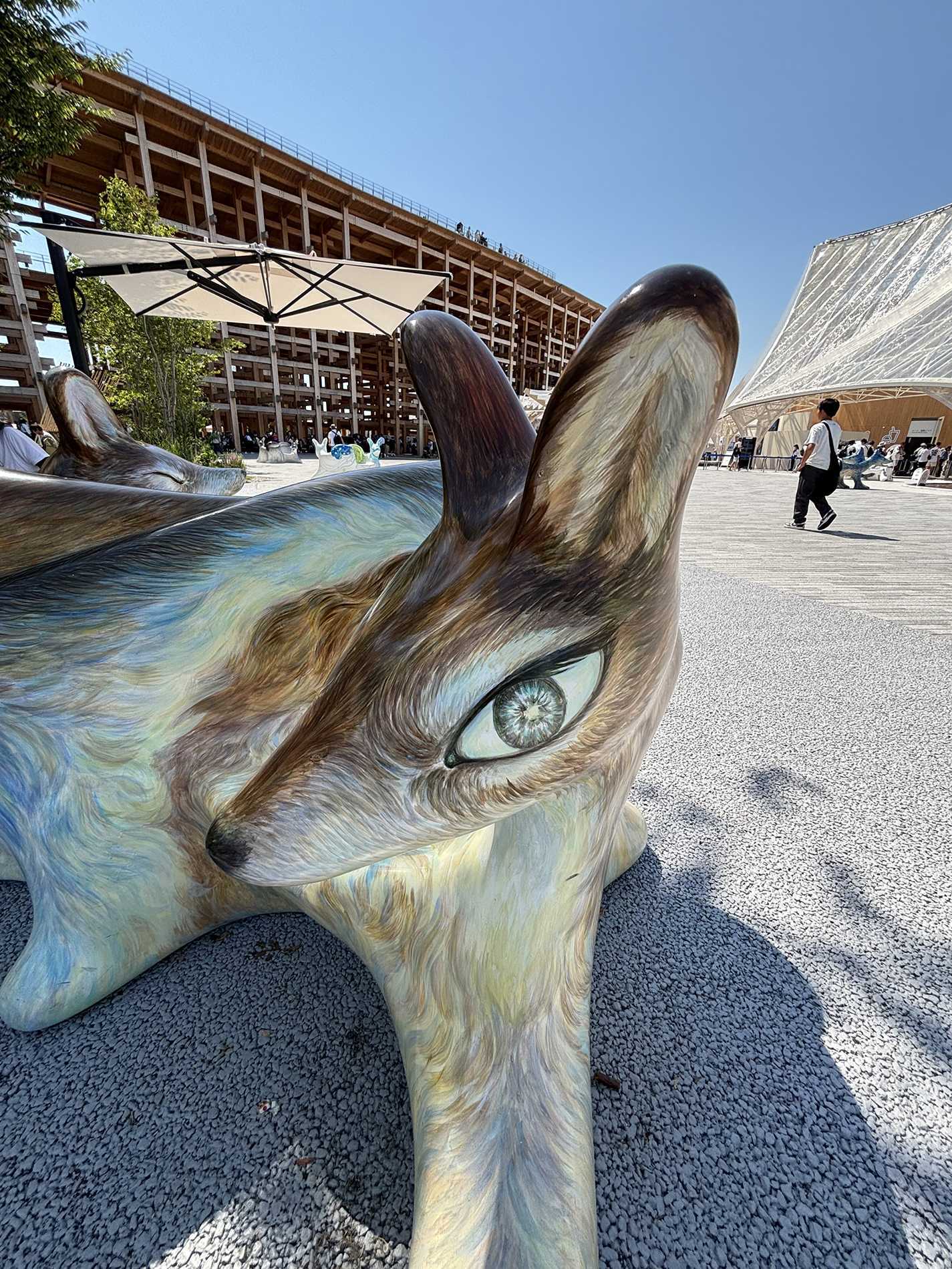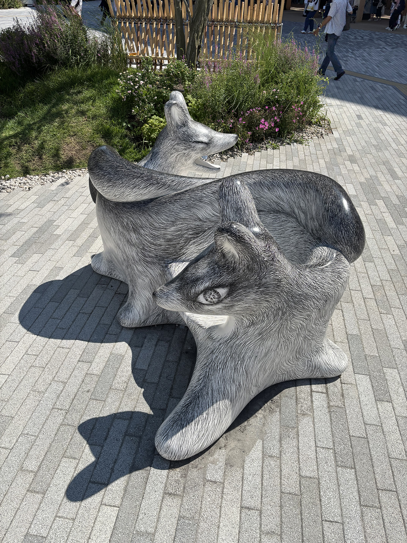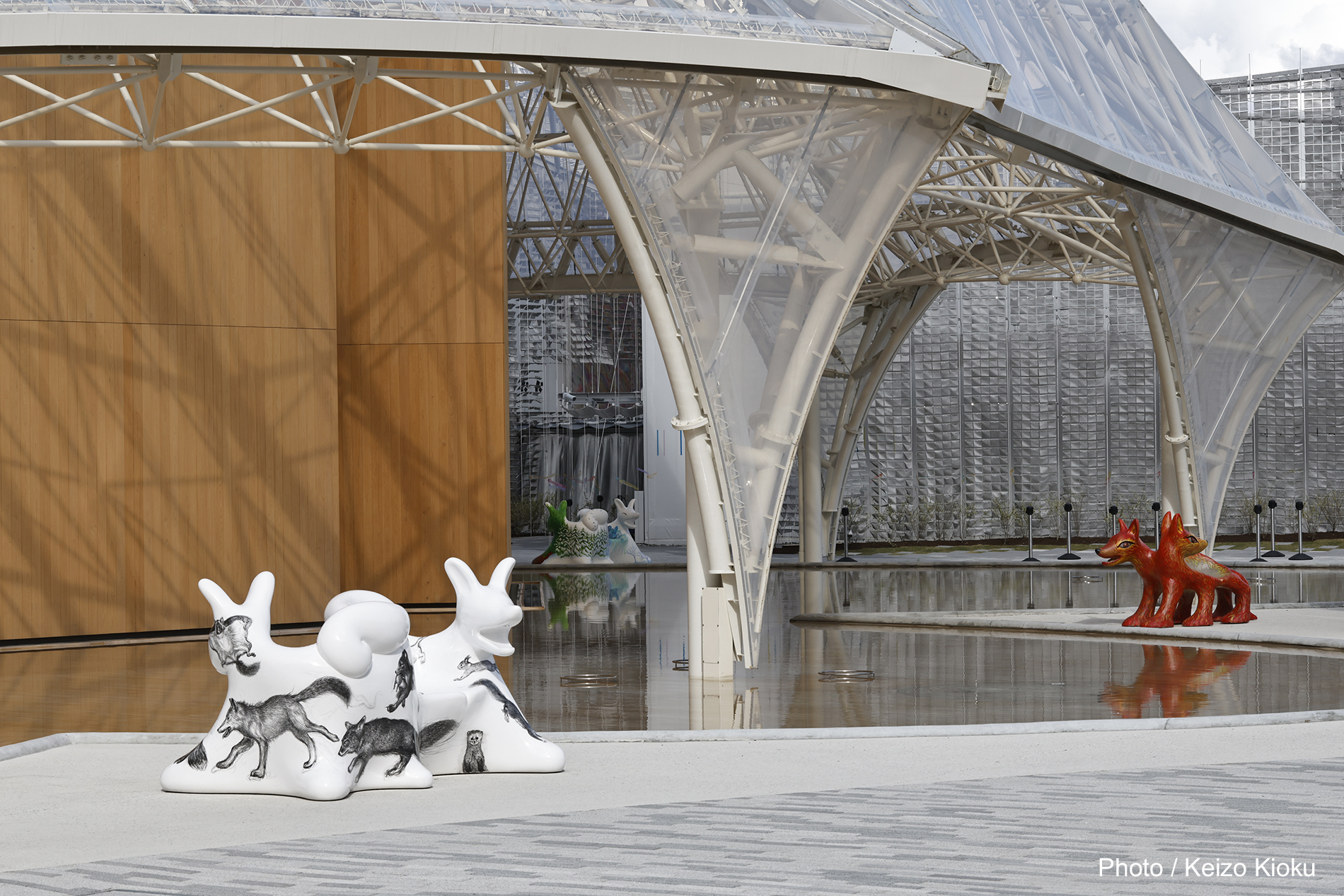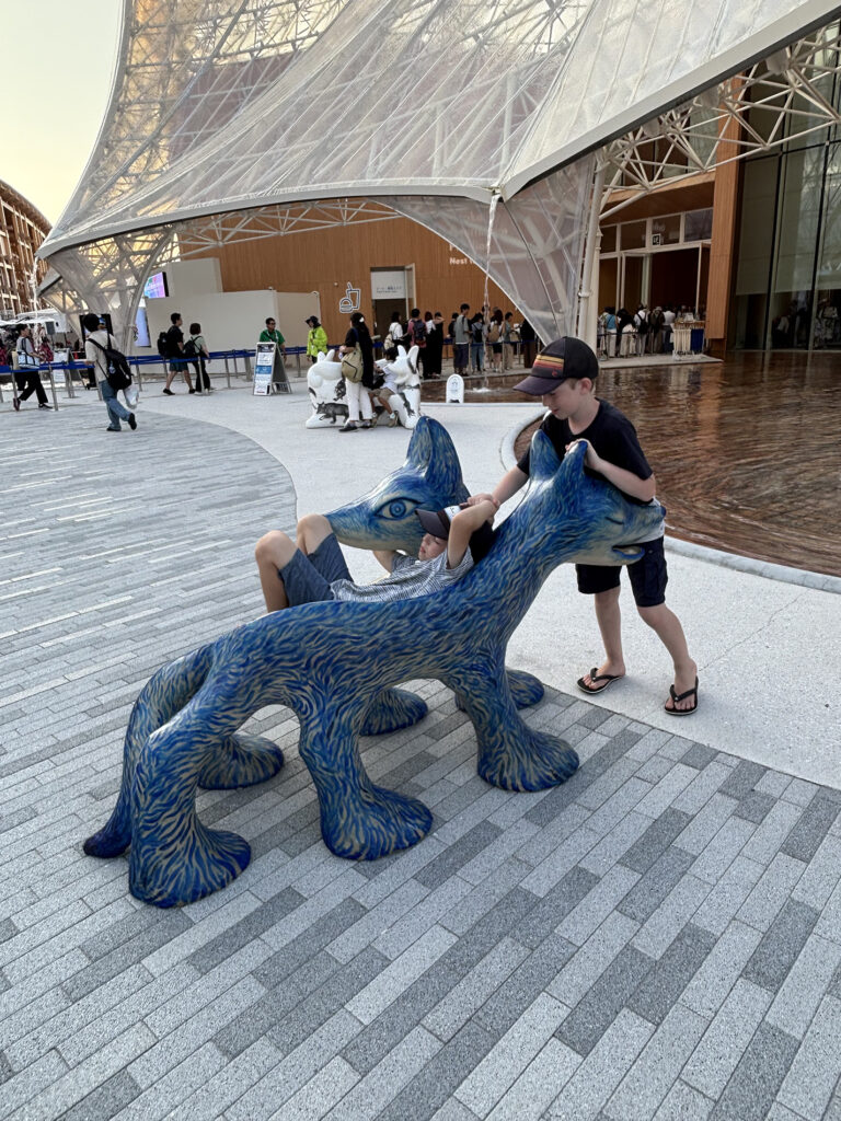 10個のオオカミベンチ(Wolf Bench)は、アーティスト鴻池朋子によって万博のために制作された座る作品で、万博終了後には作品は世界各地へ、無償で貸し出しをされていきます。「サクヤオオカミ プロジェクト」は、美術館に作品を観に行くのではなく、アートを必要とする場所へ、作品がこちらから出掛けてゆき、その場に喜びや元気を生みだしていきます。そしてまた、オオカミベンチと共に過ごした人々は、次のアートを必要としている誰かのために作品をバトンとして送りだす、という、アートが持つ本来的なエネルギー循環を目指していくプロジェクトです。オオカミがあなたを優しく包み込みます。ぜひ実際に座って、撫でてご堪能ください。
