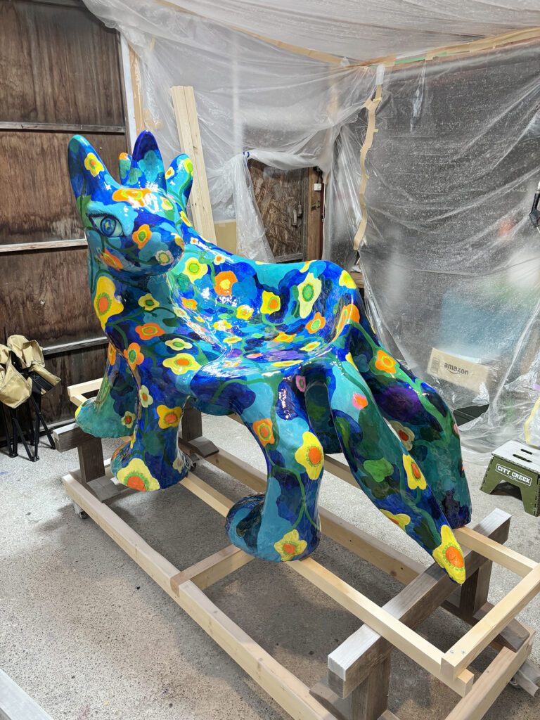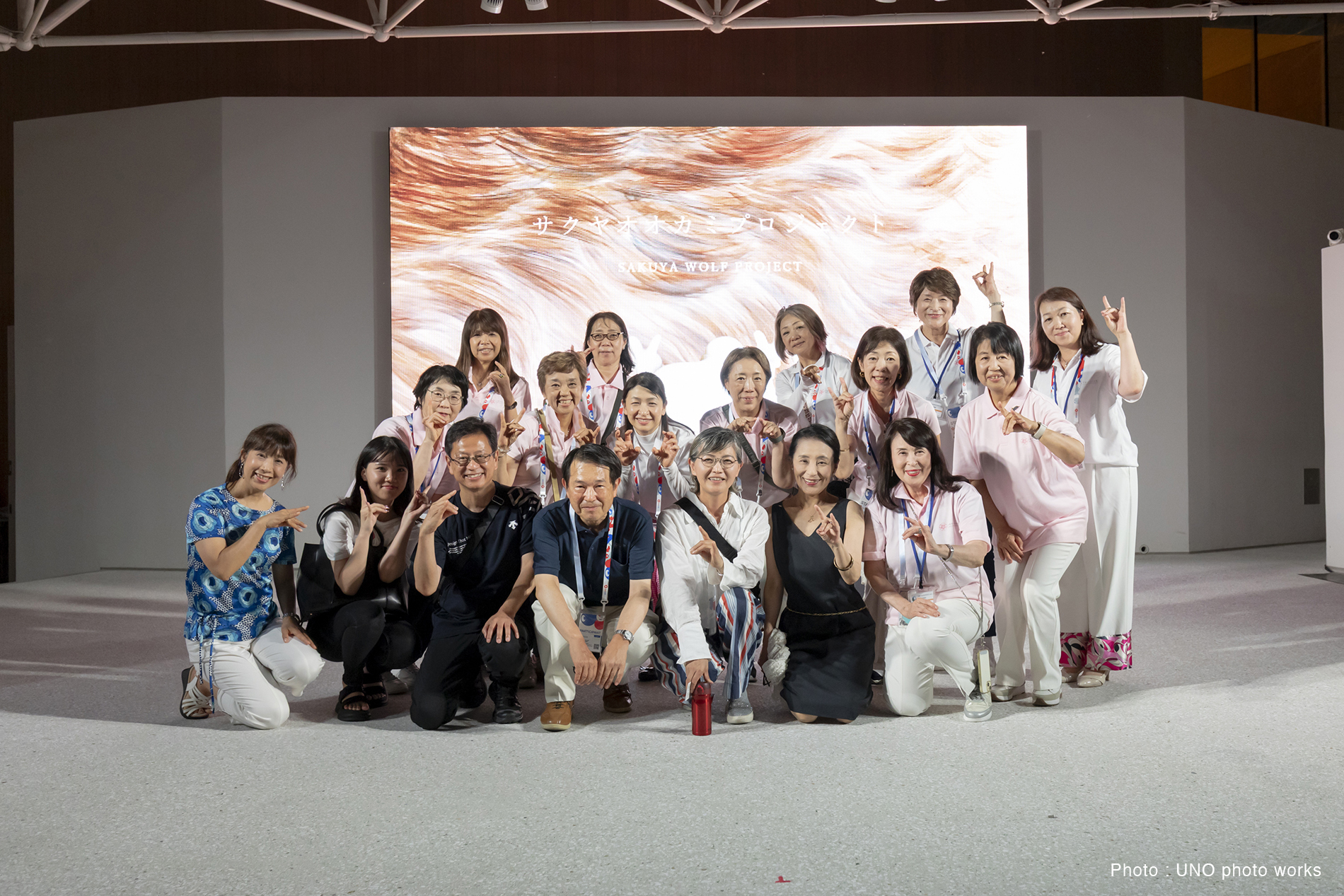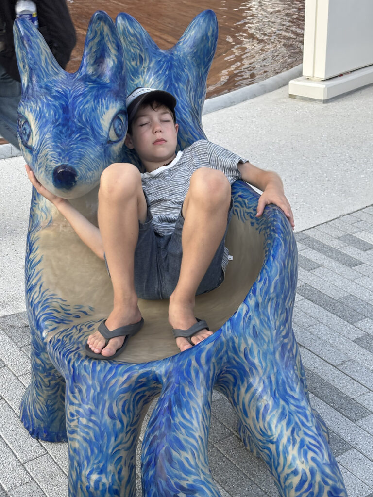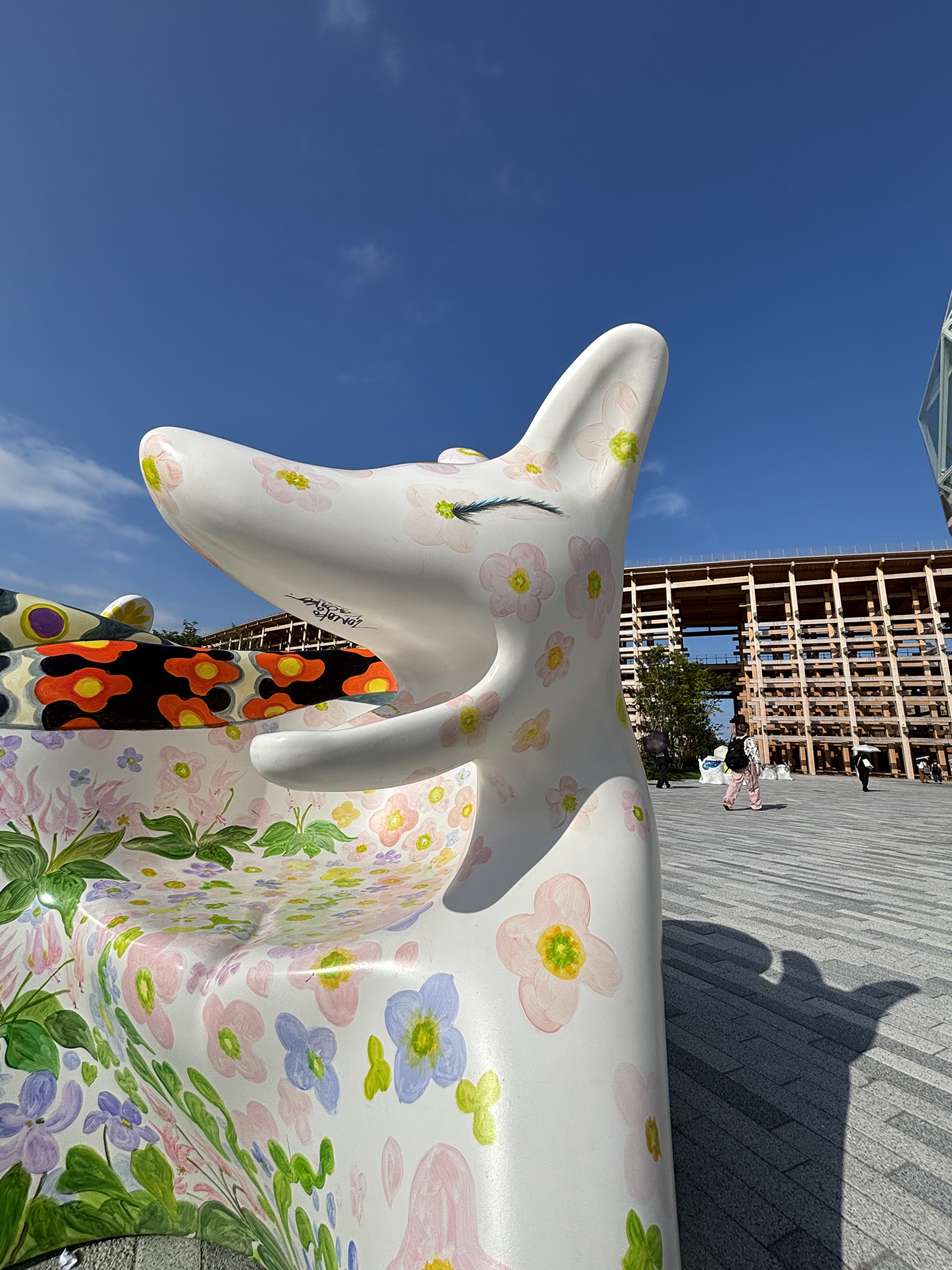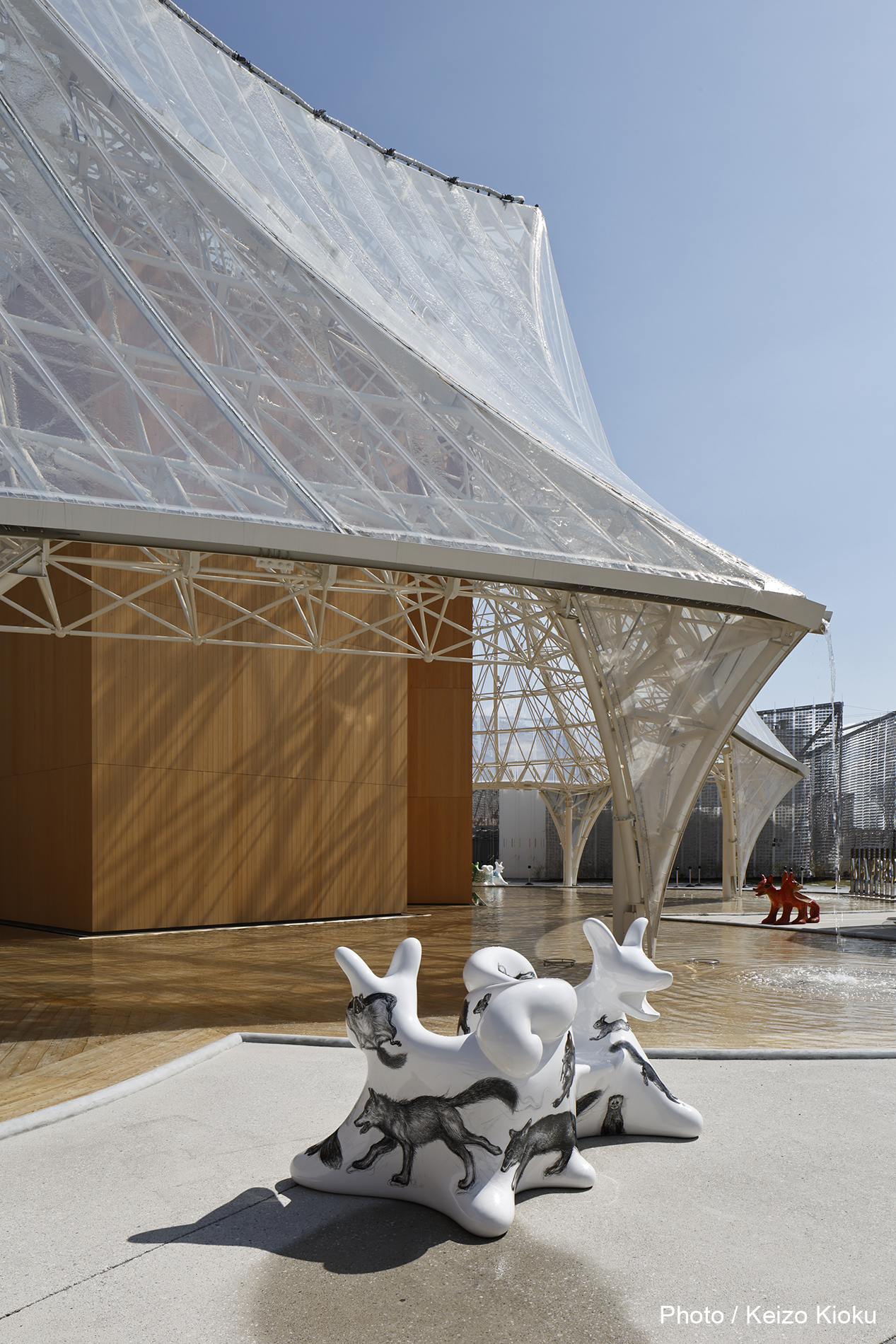 10個のオオカミベンチ(Wolf Bench)は、アーティスト鴻池朋子によって万博のために制作された座る作品で、万博終了後には作品は世界各地へ、無償で貸し出しをされていきます。「サクヤオオカミ プロジェクト」は、美術館に作品を観に行くのではなく、アートを必要とする場所へ、作品がこちらから出掛けてゆき、その場に喜びや元気を生みだしていきます。そしてまた、オオカミベンチと共に過ごした人々は、次のアートを必要としている誰かのために作品をバトンとして送りだす、という、アートが持つ本来的なエネルギー循環を目指していくプロジェクトです。オオカミがあなたを優しく包み込みます。ぜひ実際に座って、撫でてご堪能ください。