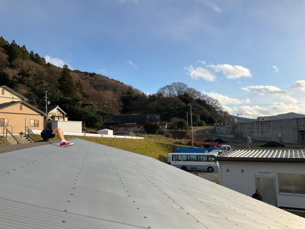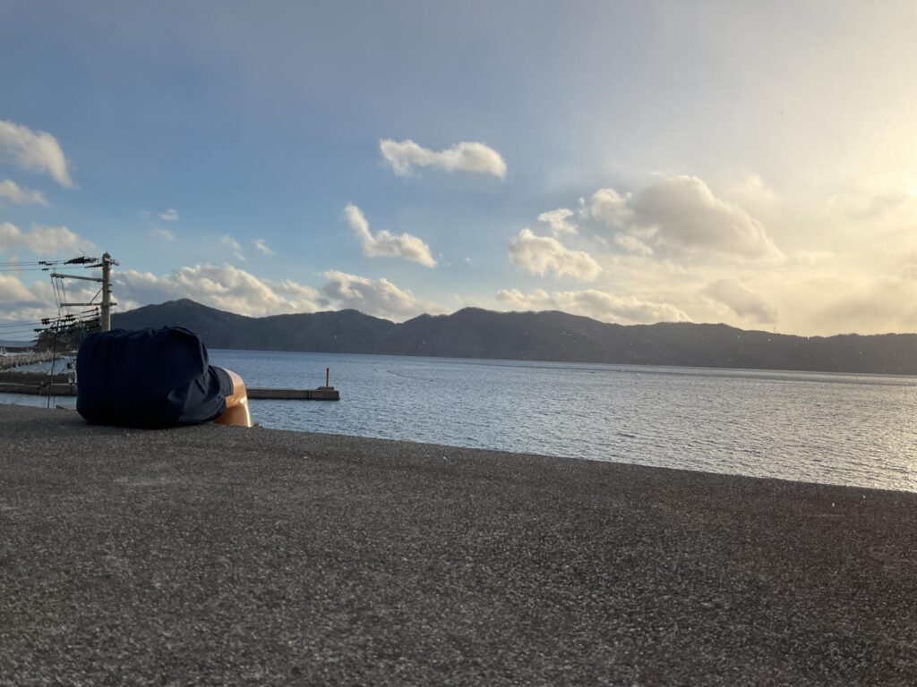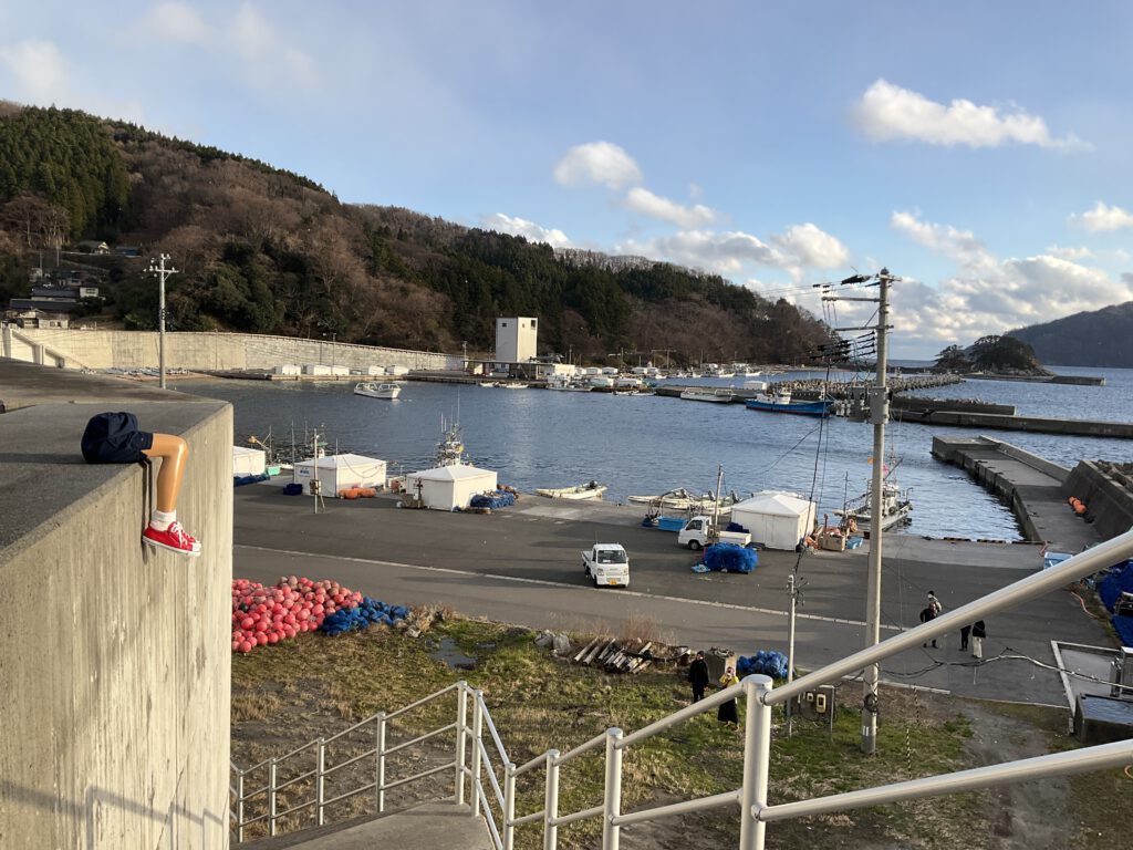 その後、外に出て当初の案でもあった屋根の上や、すぐそばにある大きな防潮堤の上にも作品を置かせてもらって写真を撮影しました。その途端作品が急にスッと風景と溶け込み始め生き生きし始めました。展示作業をしていると不思議と作品と繋がれるような気がすることがあるのですが、この時もそんな感覚を味わいました。