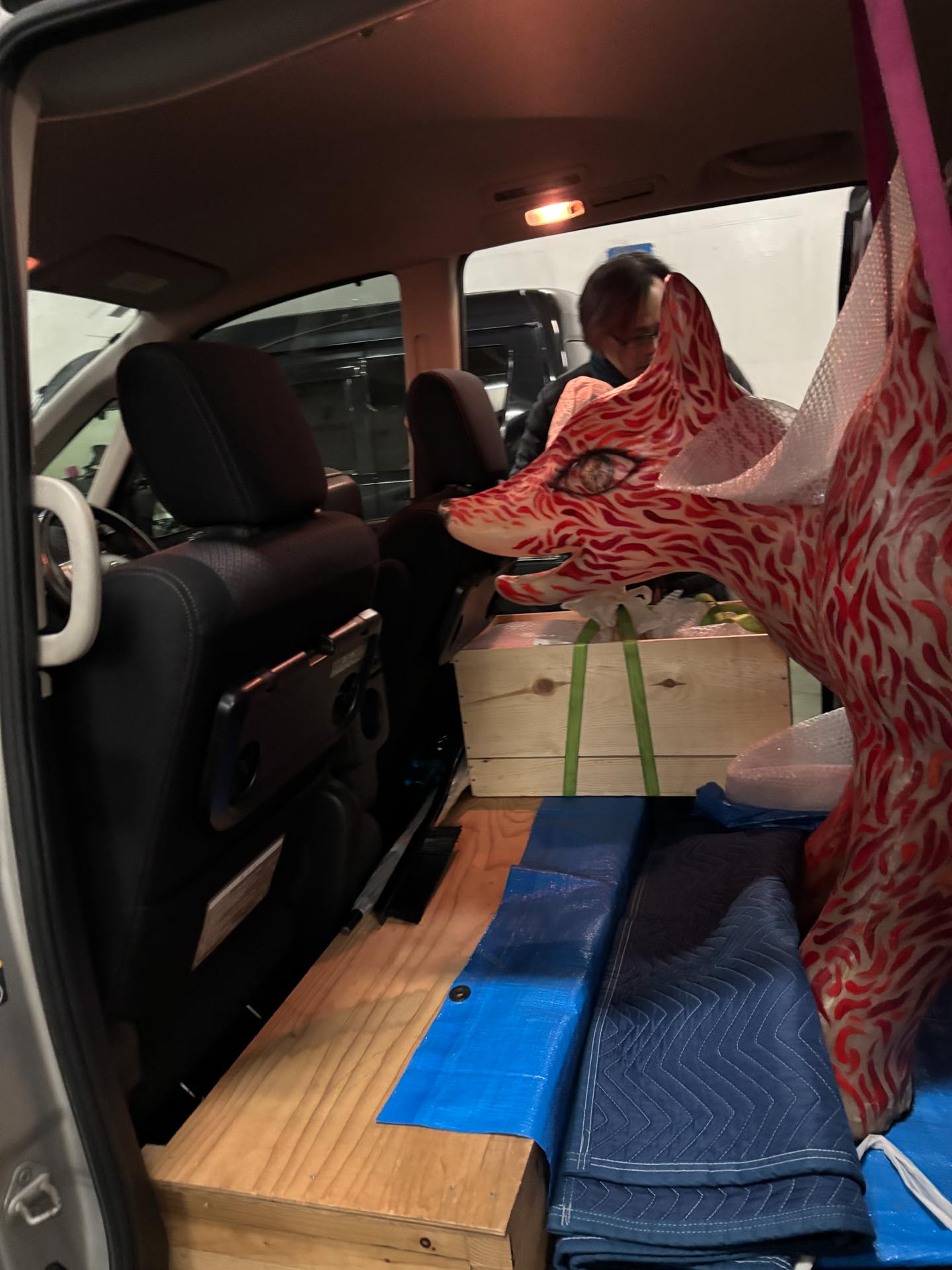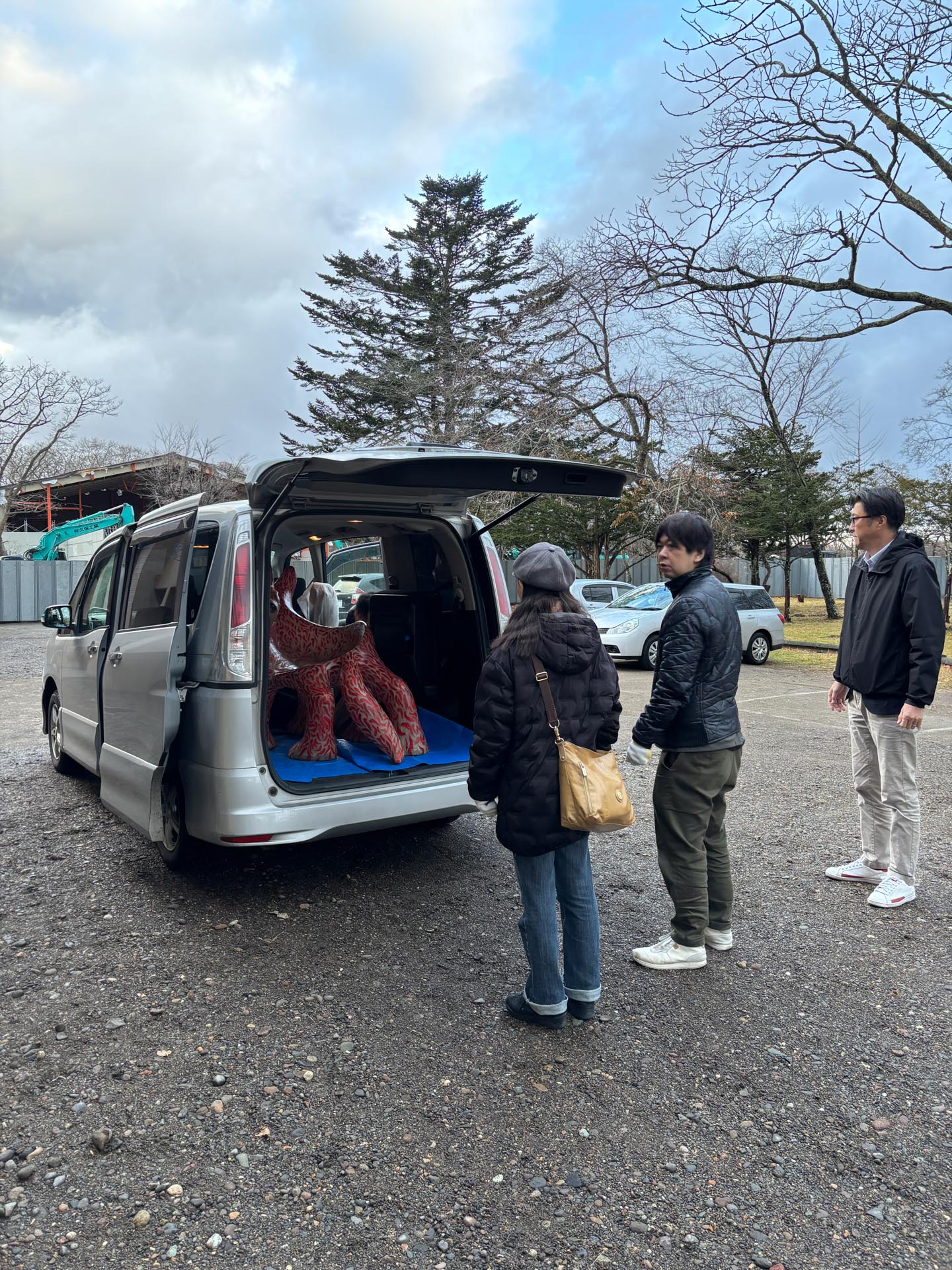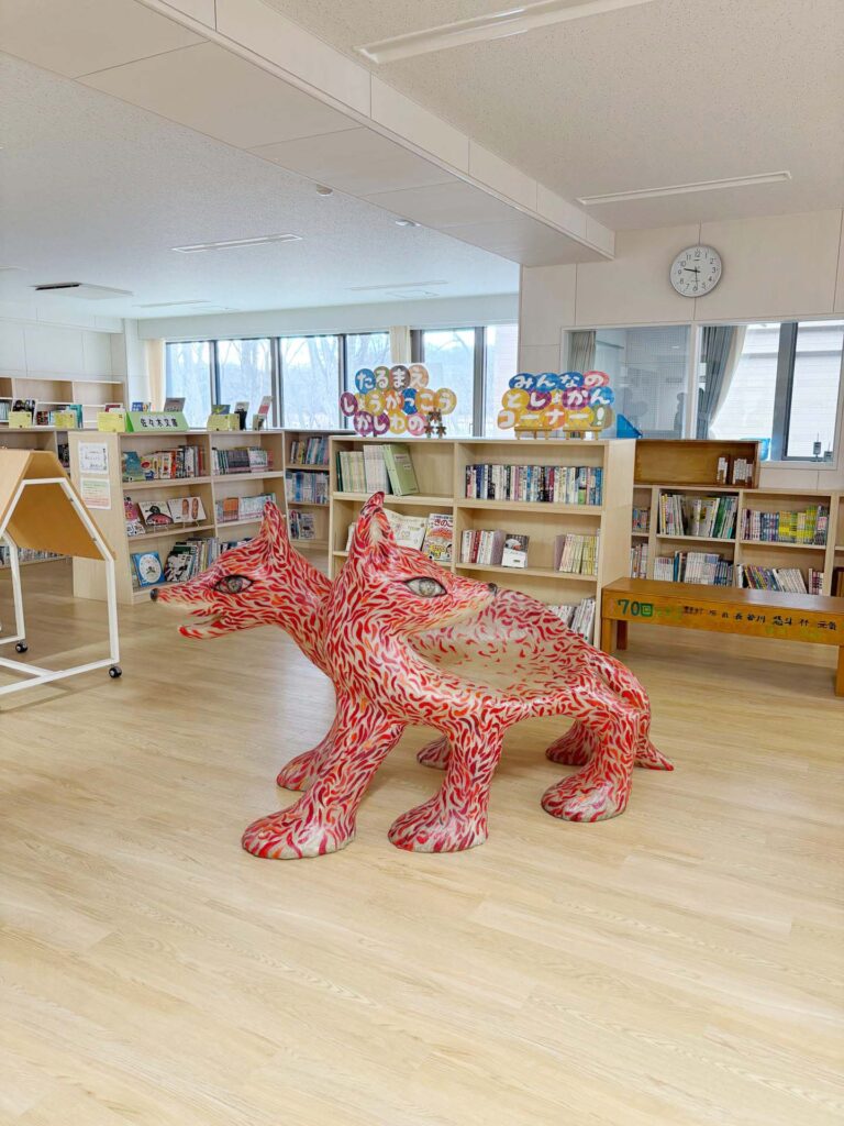 2024年12月2日。青森県立美術館での「鴻池朋子展 メディシン・インフラ」が終了して2ヶ月ほどした頃、美術館の前庭に展示されていた赤い狼ベンチを、アーティストの藤沢レオさんご協力のもと、彼の車で青森県八戸から北海道苫小牧市へフェリーで運びました。青森の個展は本州最北端での展覧会だったので、ぜひその先の津軽海峡を挟んだ北海道に、なんとか作品を“飛び火”できないかなと思っていろいろと探っておりましたら、藤沢さんの地元であり出身校でもある苫小牧市立樽前(たるまえ)小学校から設置場所のご提案をいただき、その小学校の新しく明るい図書館に、たくさんの本に囲まれて狼ベンチを置くこととなりました。藤沢さんは鉄などの金属、木、石なども扱う彫刻家で、子どもたちと「びとこま」というアート活動も長年行ってきています。全校生徒18名、居心地良い図書館は市民にも開放されており、一般の方々も利用することができるスペースです。