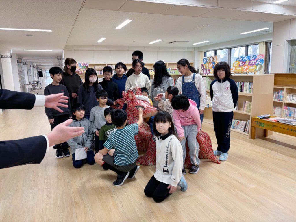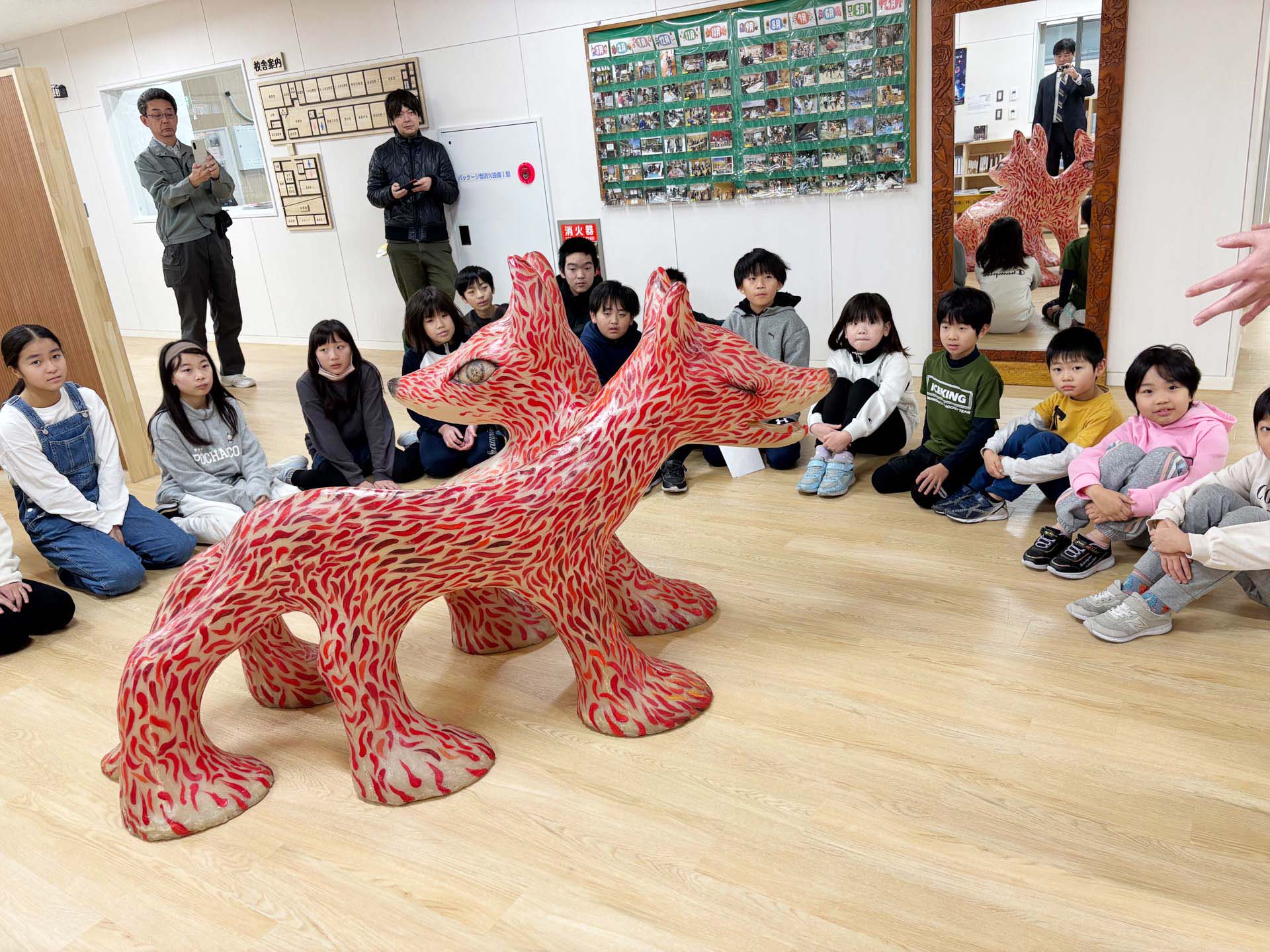 翌12月3日の朝8時半。全校朝会が終わった直後に、校長先生のお計らいで、サプライズで狼ベンチが子どもたちにお披露目されます。狼ベンチはいきなり子どもたちに取り囲まれ、触ったり、腰掛けたり、頭に跨ったり、尻尾を引っ張ったりと大歓迎を受けました。