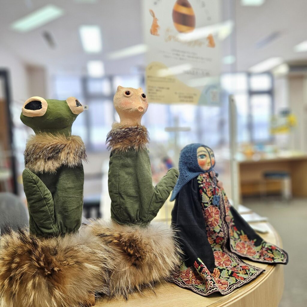田沢湖図書館に「ミトン兄弟」と「ブックカバーのスカーフさん」と呼ばれる指人形2組が設置されました。