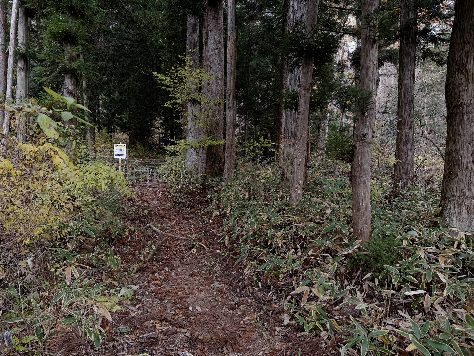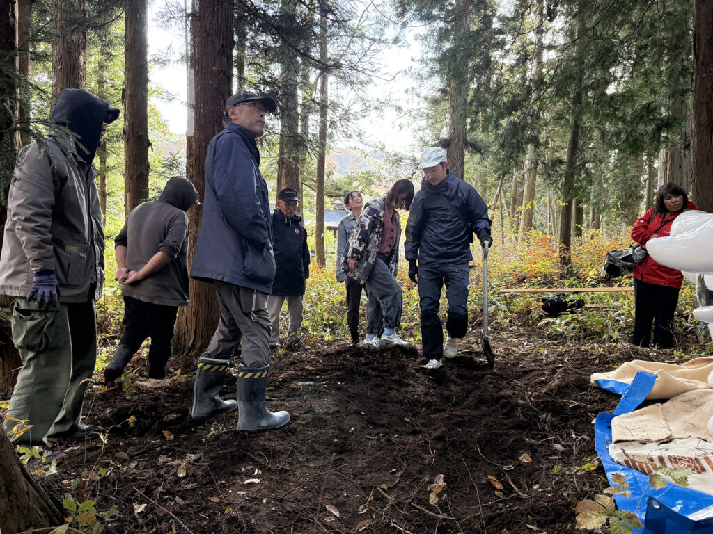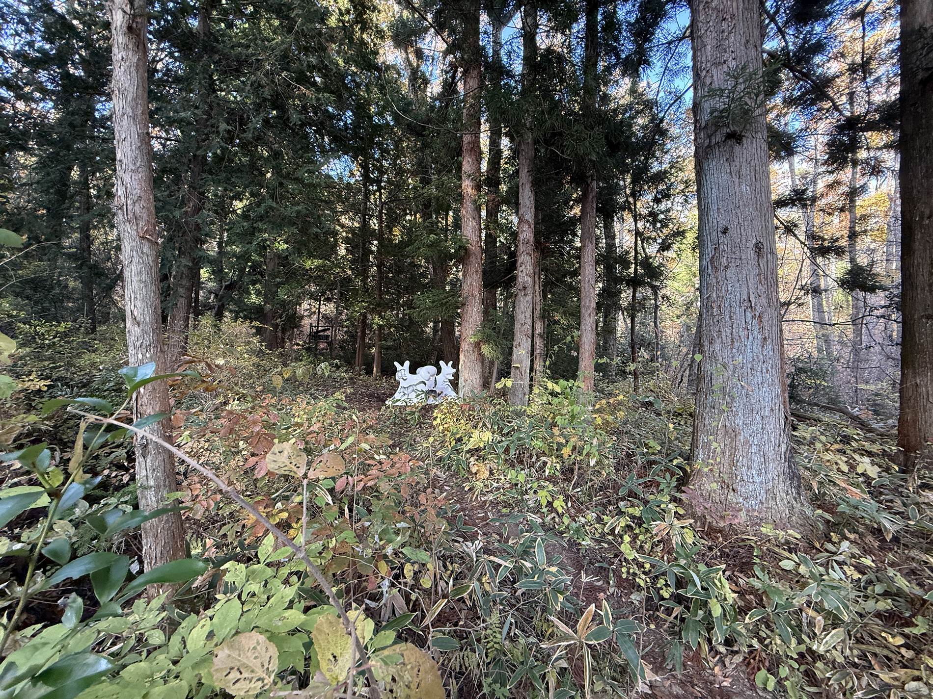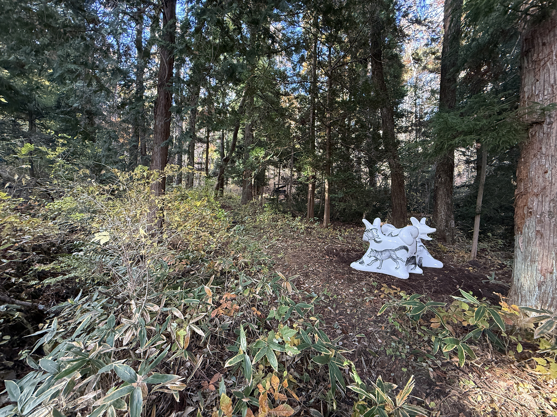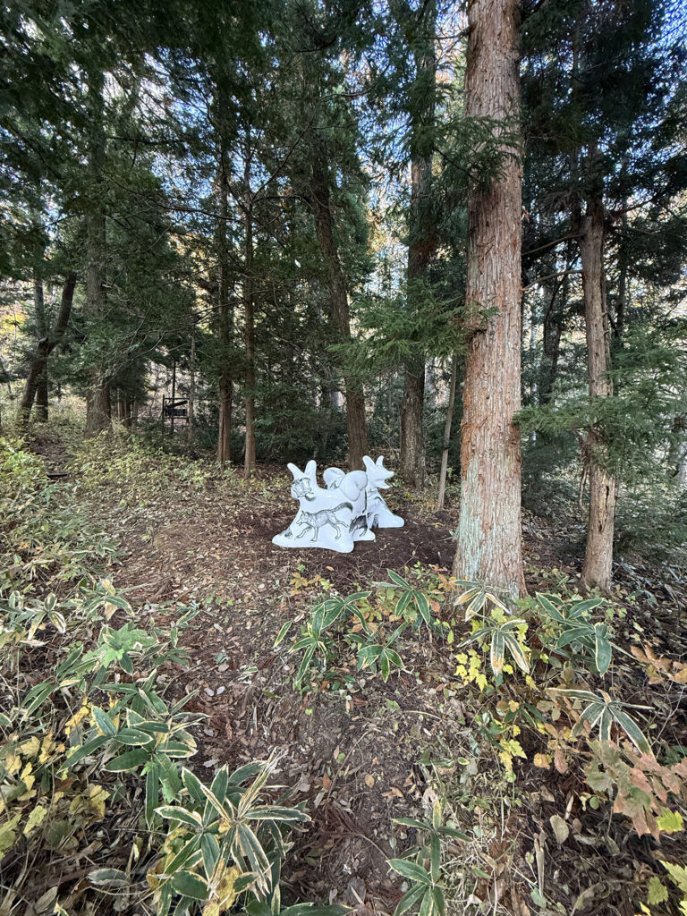 ここ山津見神社の神様は、もちろんこの山の上の本宮にいらっしゃる事になっています。けれども、もしも自然界の状況を、神様がとても憂えて心配されているのならば、神様は家に安堵してなどおらず、すぐに一番危うい場所に出向いて、しっかりとそこで私たち人間の行動を見て守っておられるのではないか、と思ったのです。14 年前に起きた大地震による自然災害と、その直後の放射能汚染という人災は、やはり日本の自然とこれまでの考え方が大きな岐路に立たされた日でした。よく経済的ダメージと言いますが、経済の始まりとなる交換とは、農耕による生産から始まり、その農耕の根幹を支える太陽や雨の恵みとは、自然界からの純粋贈与です。掛け値なしの、交換条件もない、見返りなしの、私たち人間への全く純粋な自然からの贈り物があってこその経済なのです。ここ飯舘の神様は、その大切なことを、また人間によって忘れ去られてしまわないよう、しっかりと守るべき場所、気づかせる場所に出向いていると思うのです。そう仮定してみると、オオカミベンチは、その神様の出張所と思われる場所に、目印や道標として設置するのが、ミッションとしても面白いのではないかと思いました。例えば、いま神様は除染が終わったばかりの地区の道の横の林で、見守っているような気もします。見えないものを無闇に恐れるのでも神格化するのでもなく、科学的に可視化し数値化するだけでも、また無いものとして排除し無視するのでもなく、ただそのまま感じる、ということを、弱い動物である人間は、全身全霊でしてきたように思います。