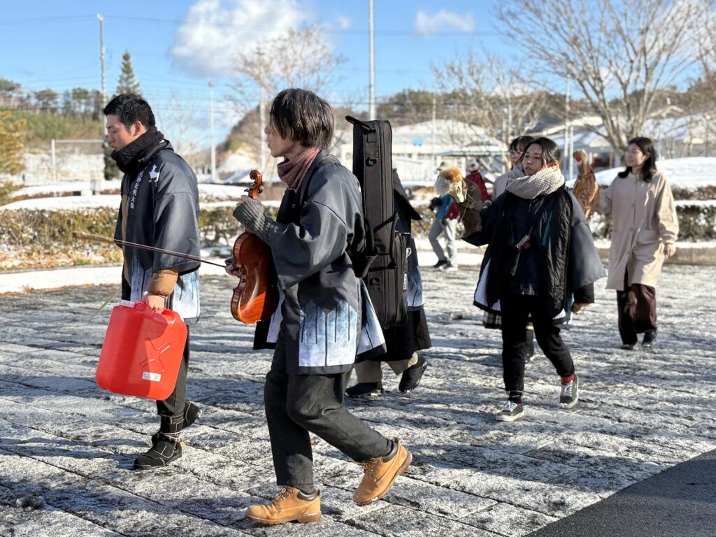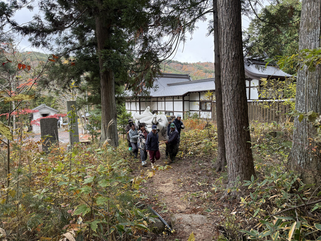 最近再開したという牧場から牛肉を直で買って、美味しいステーキもつくってくださいました。長い時間かかって、完全ではないけれども牧場や農場の土が少しずつ元に戻り、そこに草が生え、その草を牛が食べ、育ち、美味しい肉となって私の口に入る、その美味しさはひとしおです。栄養となって私の体の一部となり、健康で大満足です。が、これからはその先を考えます。人間だけの満足、人間中心の思考で終わらないために、また、私の体も地球の一部として機能するように、次へバトンタッチする何かを考えるようになります。自分の作品も人々によってリレーし、バトンタッチしていける構造を持ったものにしたいと思いました。この様に、あらゆる当たり前の大切さを、改めて意識化してくれる飯舘村は、私にとってまるで自然の学校のように見えてきました。今でこそ地球温暖化と、それによる人間のエコロジー不安という問題で世界の研究が盛んになりましたが、飯舘は 15 年前の震災という未曾有の自然災害と原発事故による人災を被り、人間が地球にしてきた無謀なコントロールの実態というものに直面し、いち早くそのトラブルシューティングに具体的に取り組み、実験、実践してこられたのだと思います。私が飯舘という場所が地球の“へそ”みたいだと感じるのは、自然豊かな場所であり大きな災害があった場所であると同時に、それによって場の時間軸が変わり普遍性を帯び、人間界と自然界の結界のように感じるからと思います。