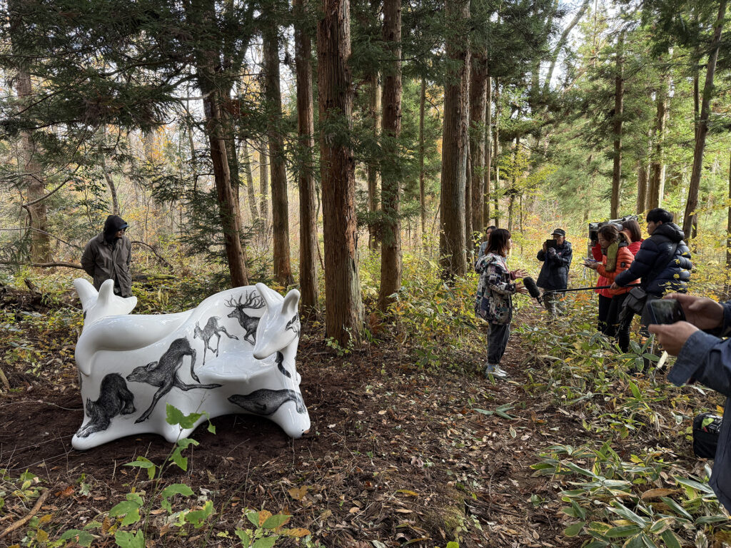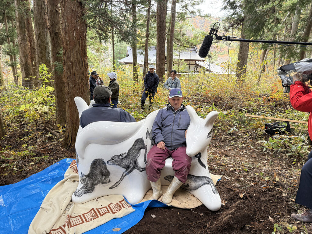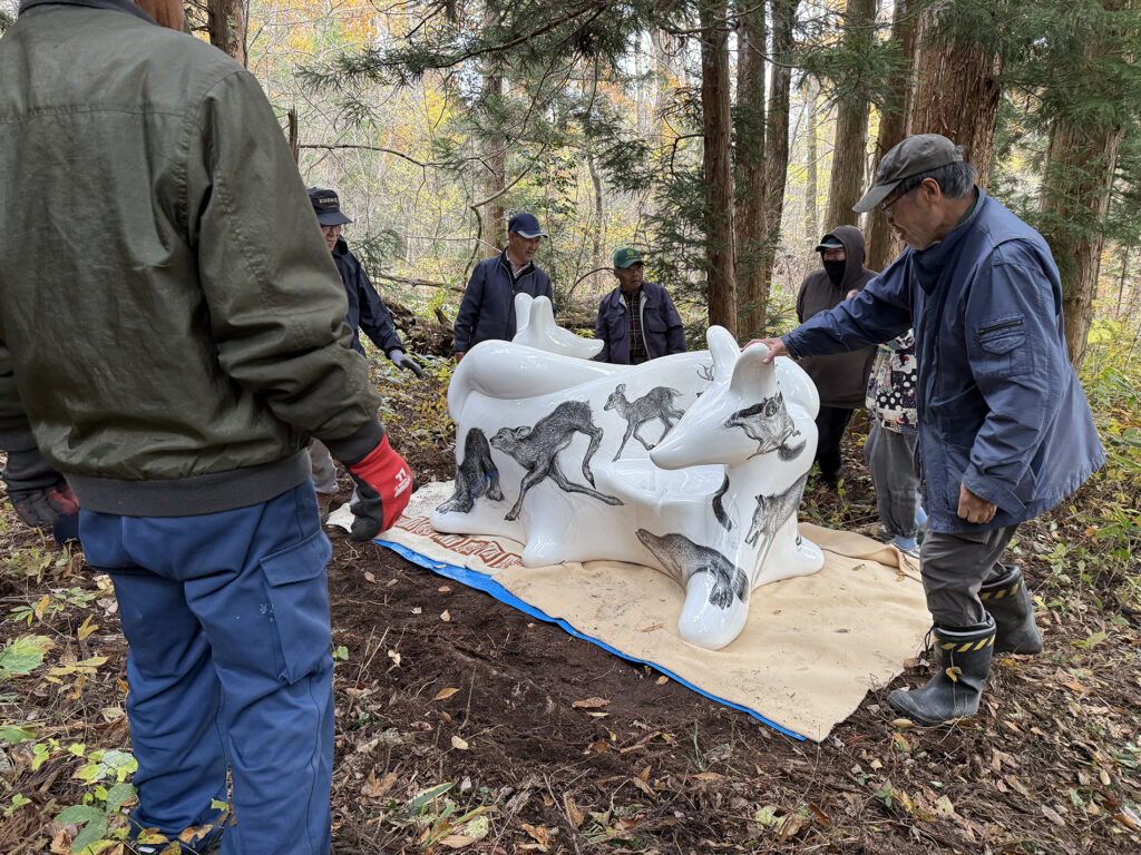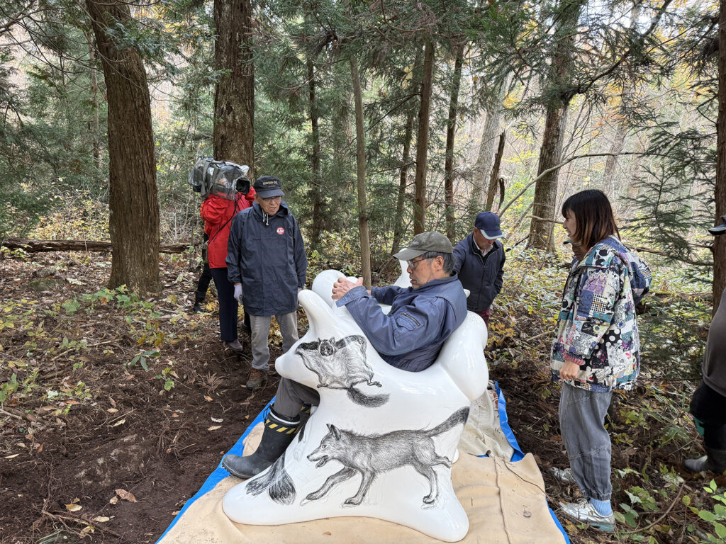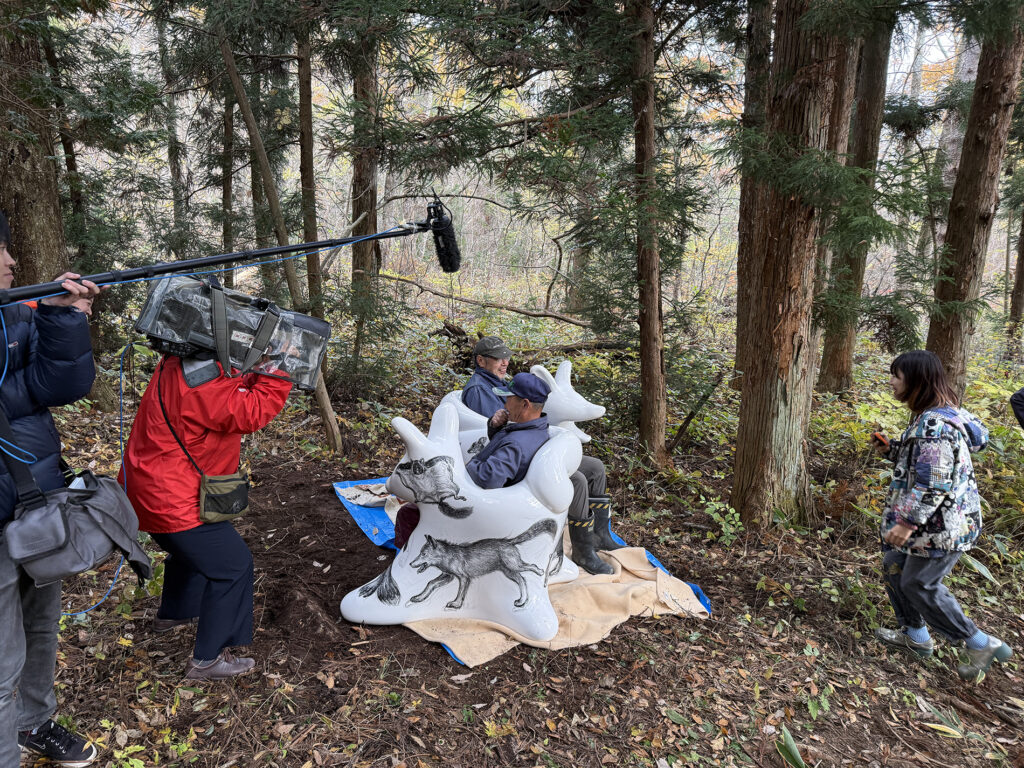 今回の万博で作品の貸し出しプロジェクトが固まってきた時に、オオカミベンチの作品の一つは、ぜひ福島の飯舘村に置きたい、と、これは迷いなく思いました。なぜなら、飯舘村はある種の地球の“へそ”のように思ったからです。そういう場所は繊細で、時間が経つと、また私たち人間によって掻き消されていってしまう恐れがあります。忘れないように、目印としてでもベンチをおく必要があるように思いました。