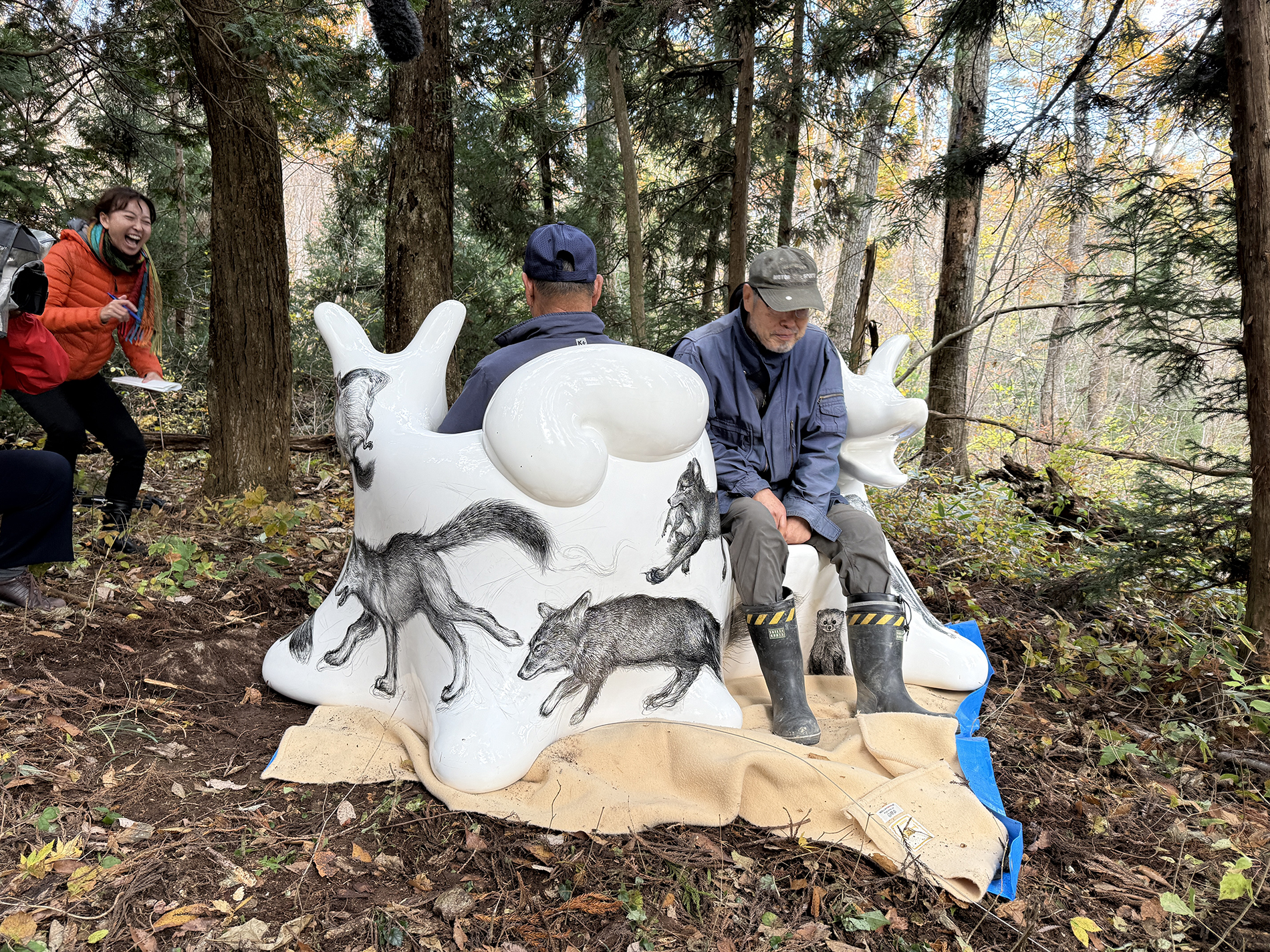 この度、オオカミベンチ(Wolf Bench)を飯舘村の、ここ山津見神社に設置することになりました。私はこのベンチを制作したアーティストの鴻池朋子です。