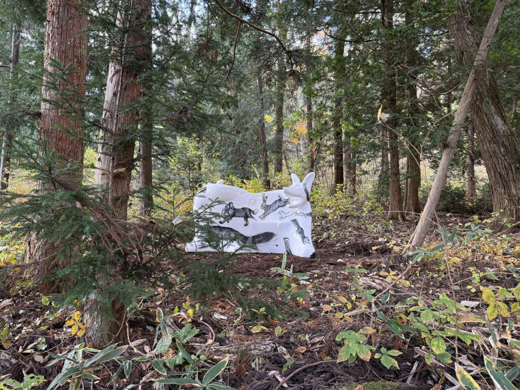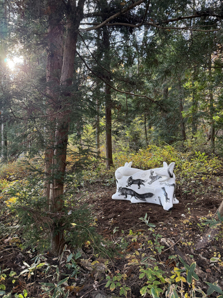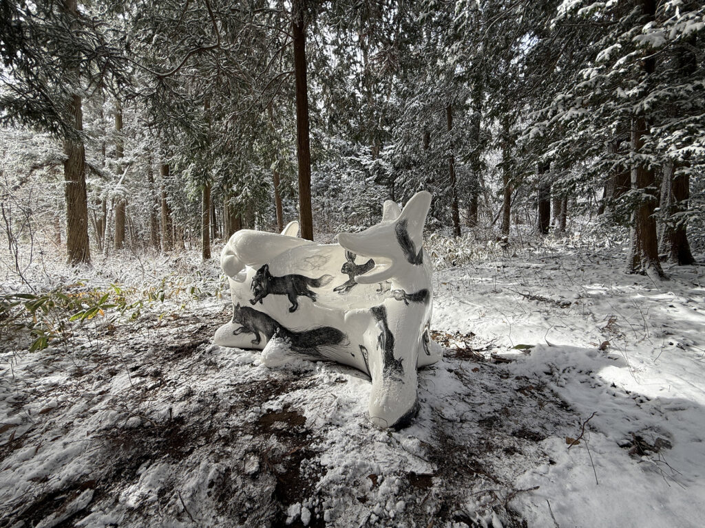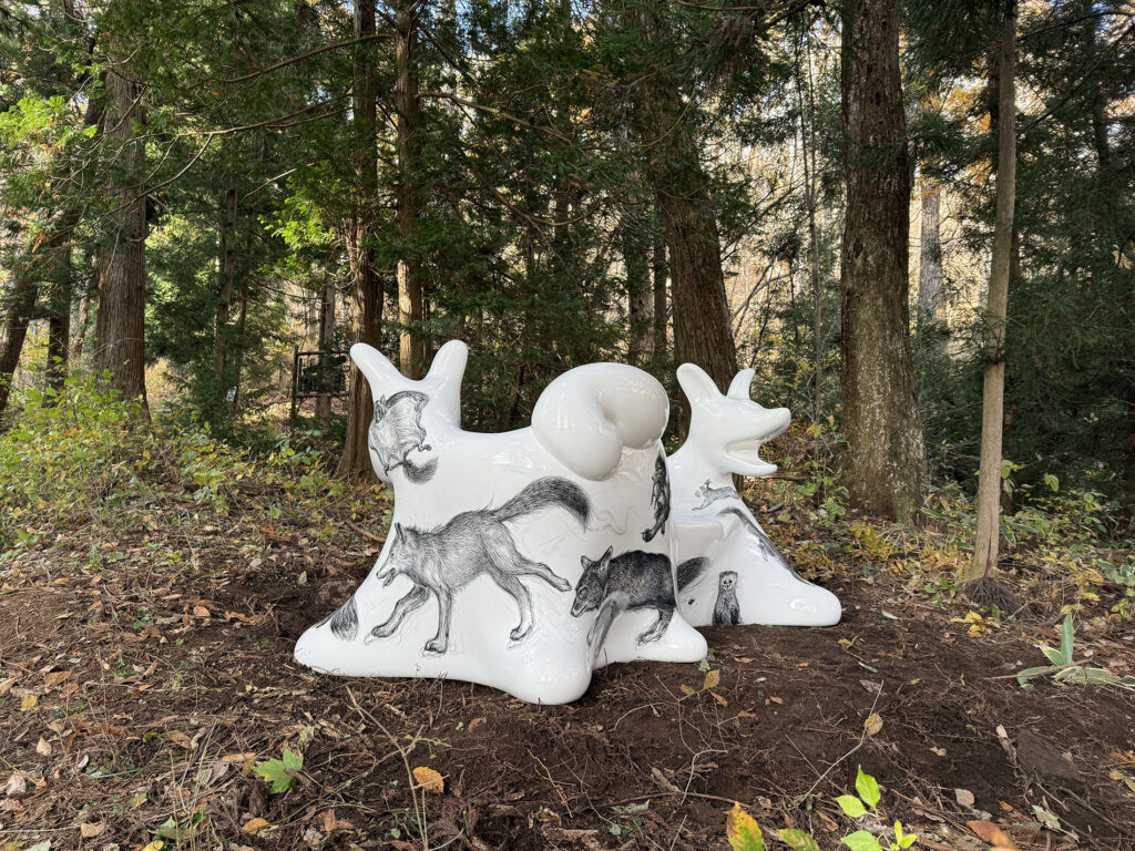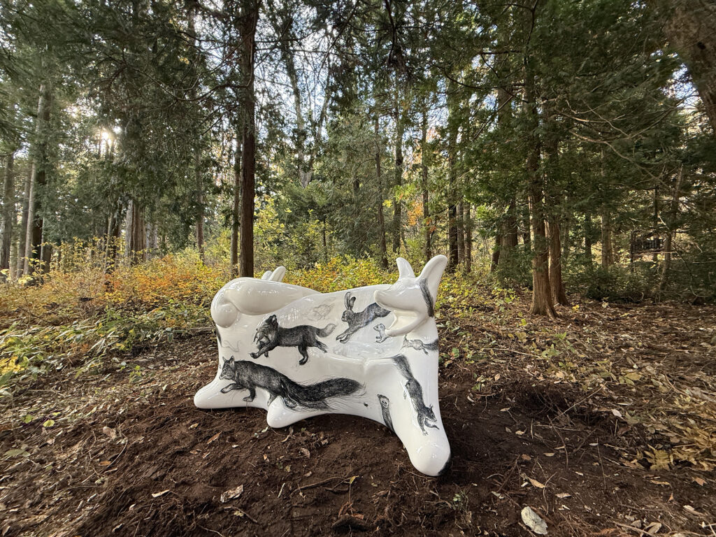 この作品は、今年開催された大阪・関西万博2025 の大阪ヘルスケアパビリオン前に設置されたオオカミベンチ10 体の内の一つです。それらの作品は全て違う絵柄が描かれ、万博の終了後には私と縁のあった場所や人々へ無償で貸し出しされてゆく、というプロジェクトのもとに制作されました。こちらのオオカミベンチはS 字型の二人掛けで、二匹の狼がそれぞれ別々の方向を向き、尻尾で絡み合って一つのベンチとなっています。ボディには狐、兎、テン、アザラシ、狼などの動物たちが直にドローイングされ、それらのモチーフは私のアトリエにある古い毛皮のコートや剥製動物からヒントをもらい描きました。他の9 体のオオカミベンチも、現在、全国各地へと貸し出しされていっております。