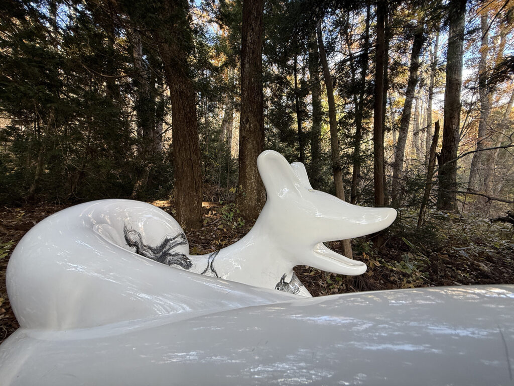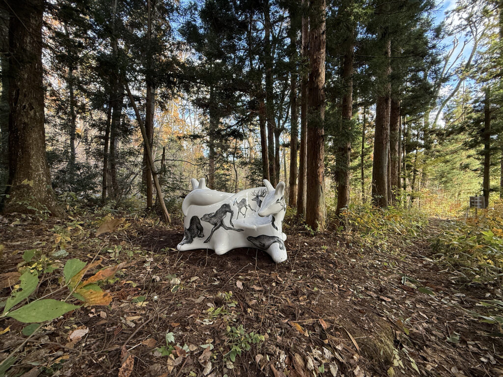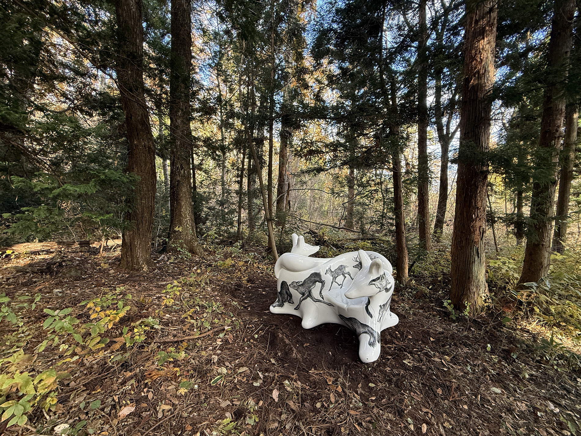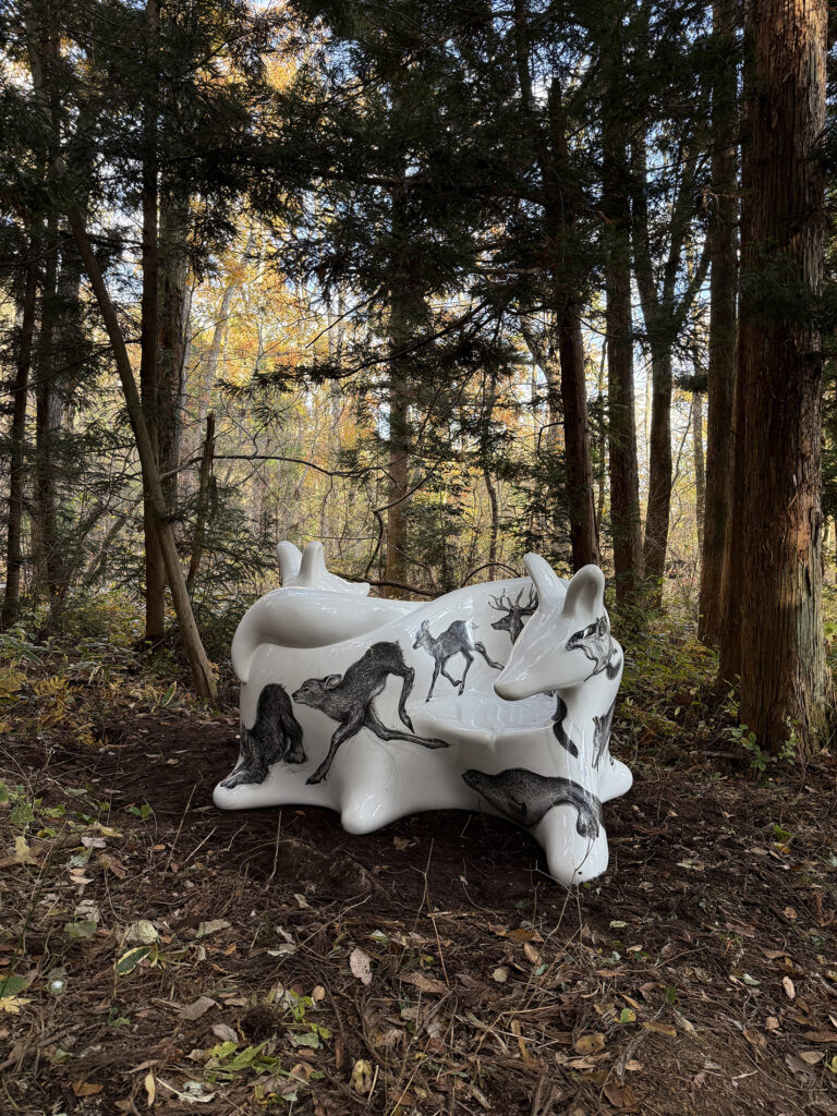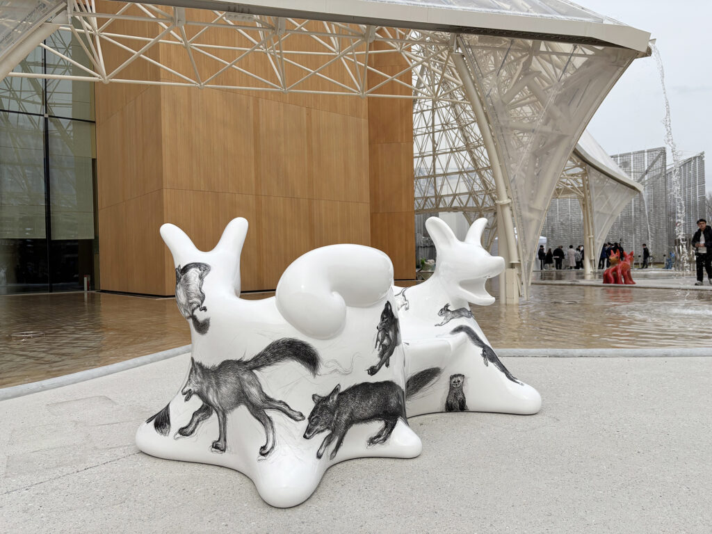この作品は、今年開催された大阪・関西万博2025 の大阪ヘルスケアパビリオン前に設置されたオオカミベンチ10 体の内の一つです。それらの作品は全て違う絵柄が描かれ、万博の終了後には私と縁のあった場所や人々へ無償で貸し出しされてゆく、というプロジェクトのもとに制作されました。こちらのオオカミベンチはS 字型の二人掛けで、二匹の狼がそれぞれ別々の方向を向き、尻尾で絡み合って一つのベンチとなっています。ボディには狐、兎、テン、アザラシ、狼などの動物たちが直にドローイングされ、それらのモチーフは私のアトリエにある古い毛皮のコートや剥製動物からヒントをもらい描きました。他の9 体のオオカミベンチも、現在、全国各地へと貸し出しされていっております。